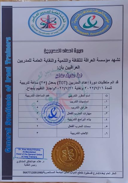 - شهادة المدرب ToT من النقابة العامة للمدربين العراقيين.