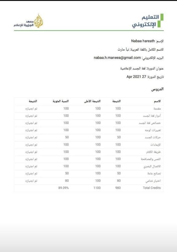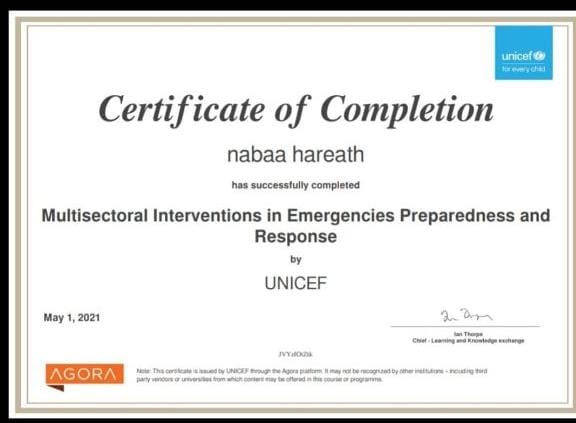 - حاصلة على 12 مهارة موثقة بشهادات من منصات معترف بيها من ضمنها اليونسيف والجزيرة للتعليم الالكتروني.