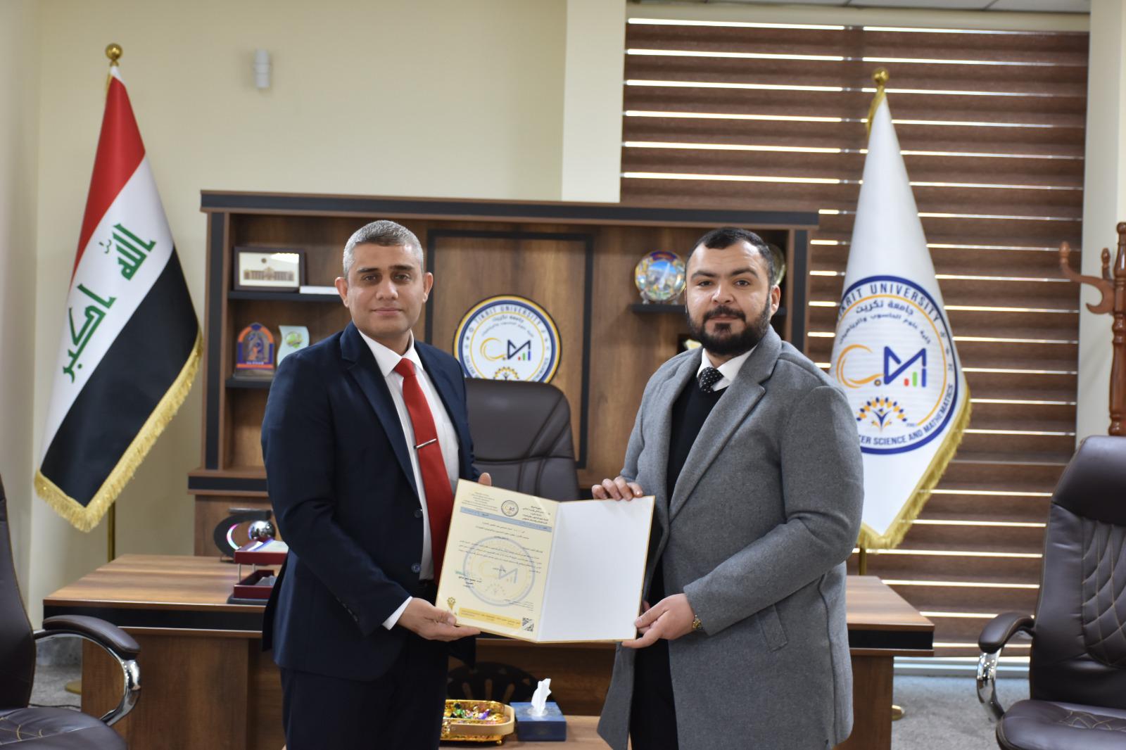 هذا وقد حضر المناقشة الأستاذ الدكتور حسن حسين إبراهيم المحترم مساعد رئيس الجامعة للشؤون العلمية و الأستاذ المساعد الدكتور محمود ماهر صالح المحترم عميد كلية علوم الحاسوب والرياضيات، وعدد من التدريسيين وطلبة الدراسات العليا في الكلية، من جانبه قدم السيد عميد الكلية كتاب شكر وتقدير للدكتور احمد صبحي عبد الغفور تثميناً لجهوده العلمية في تقييم هذه الرسالة .