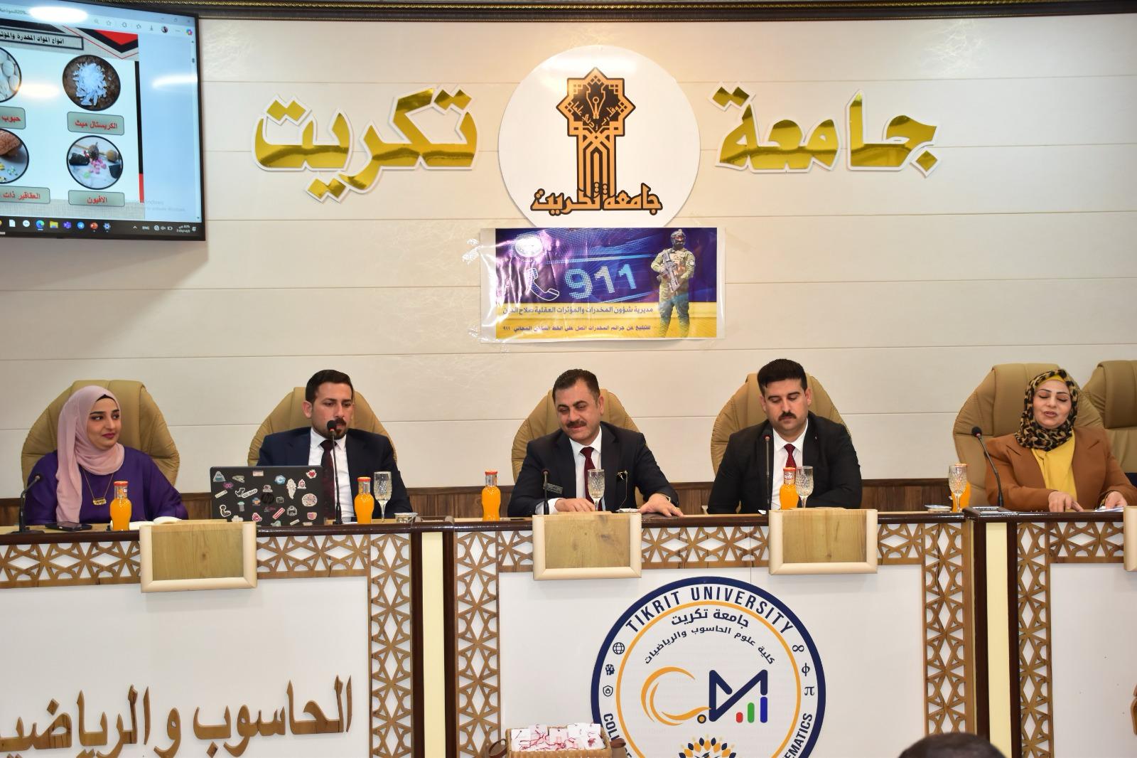 برعاية الاستاذ الدكتور وعد محمود رؤوف المحترم رئيس جامعة تكريت وبإشراف الاستاذ المساعد الدكتور محمود ماهر صالح المحترم عميد كلية علوم الحاسوب والرياضيات واشراف الاستاذ المساعد الدكتور سياف عبدحسين المحترم مدير مركز التعليم المستمر اقامت وحدة شؤون المرأة في كلية علوم علوم الحاسوب والرياضيات وبالتعاون مع مديرية مكافحة المخدرات والمؤثرات العقلية /شرطة صلاح الدين ،ندوة توعوية بعنوان (أنت ِ الامل .. لا للمخدرات)اليوم الاحد الموافق 11- 5-2025 من قبل المحاضرون :