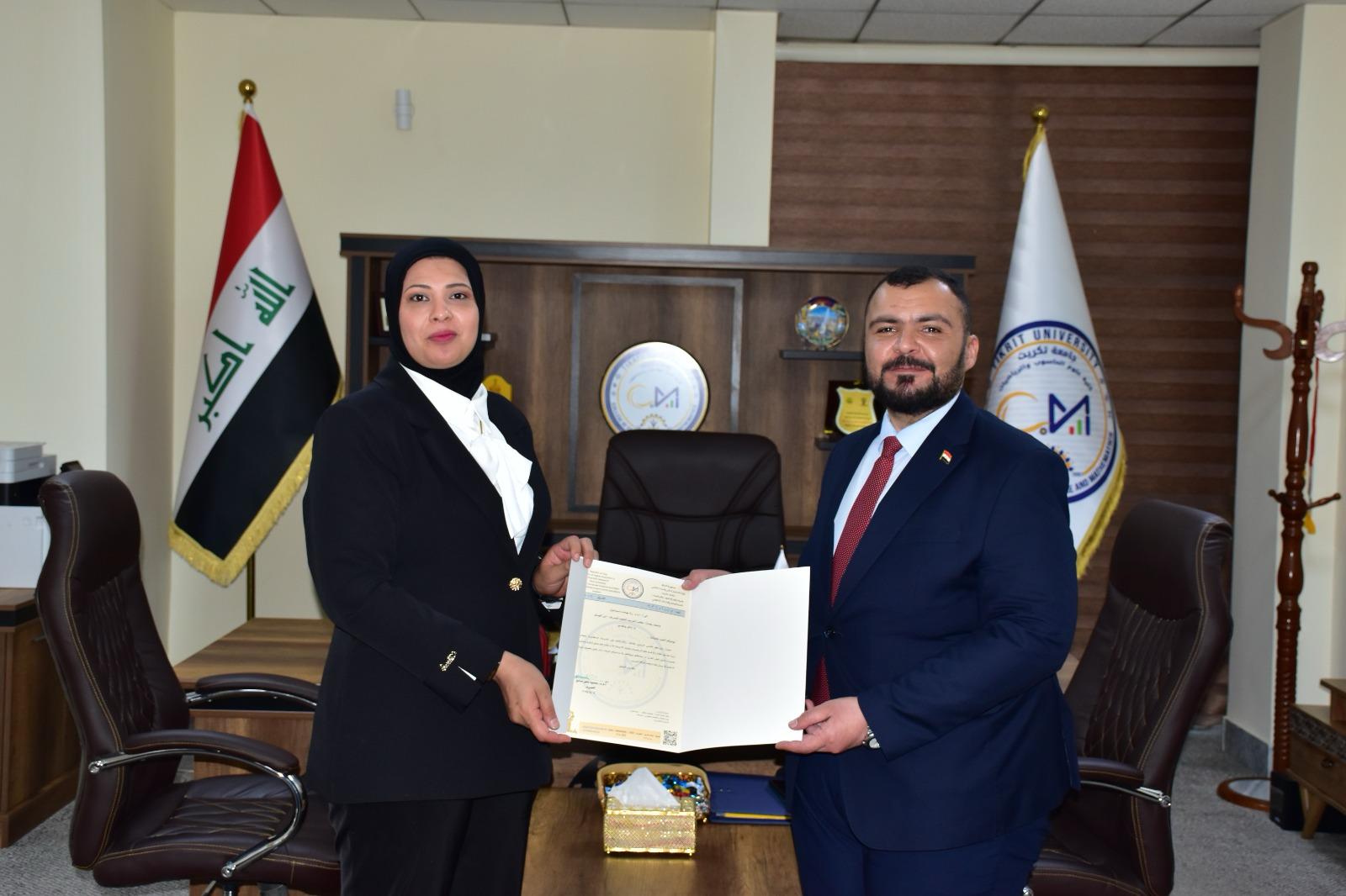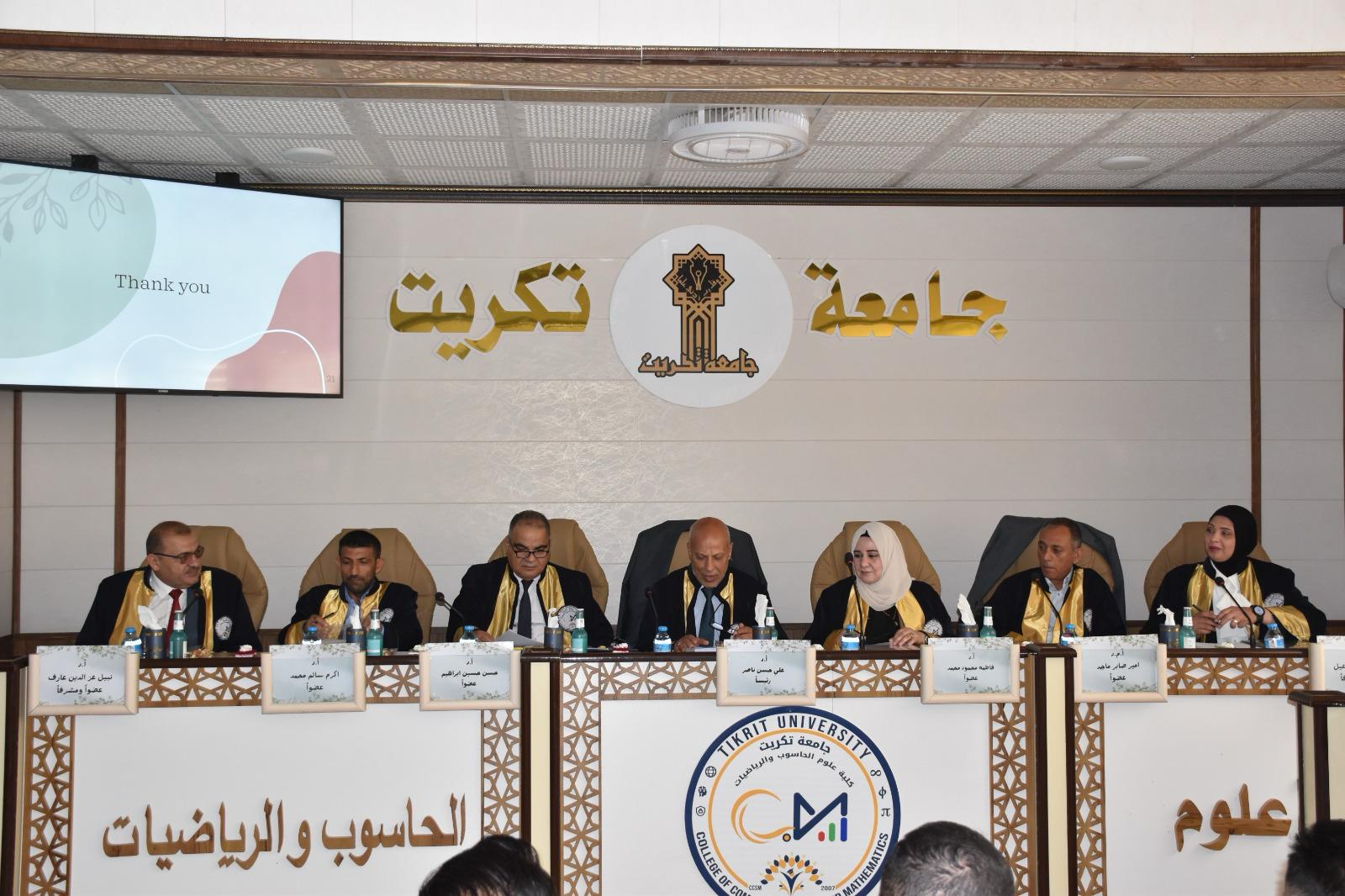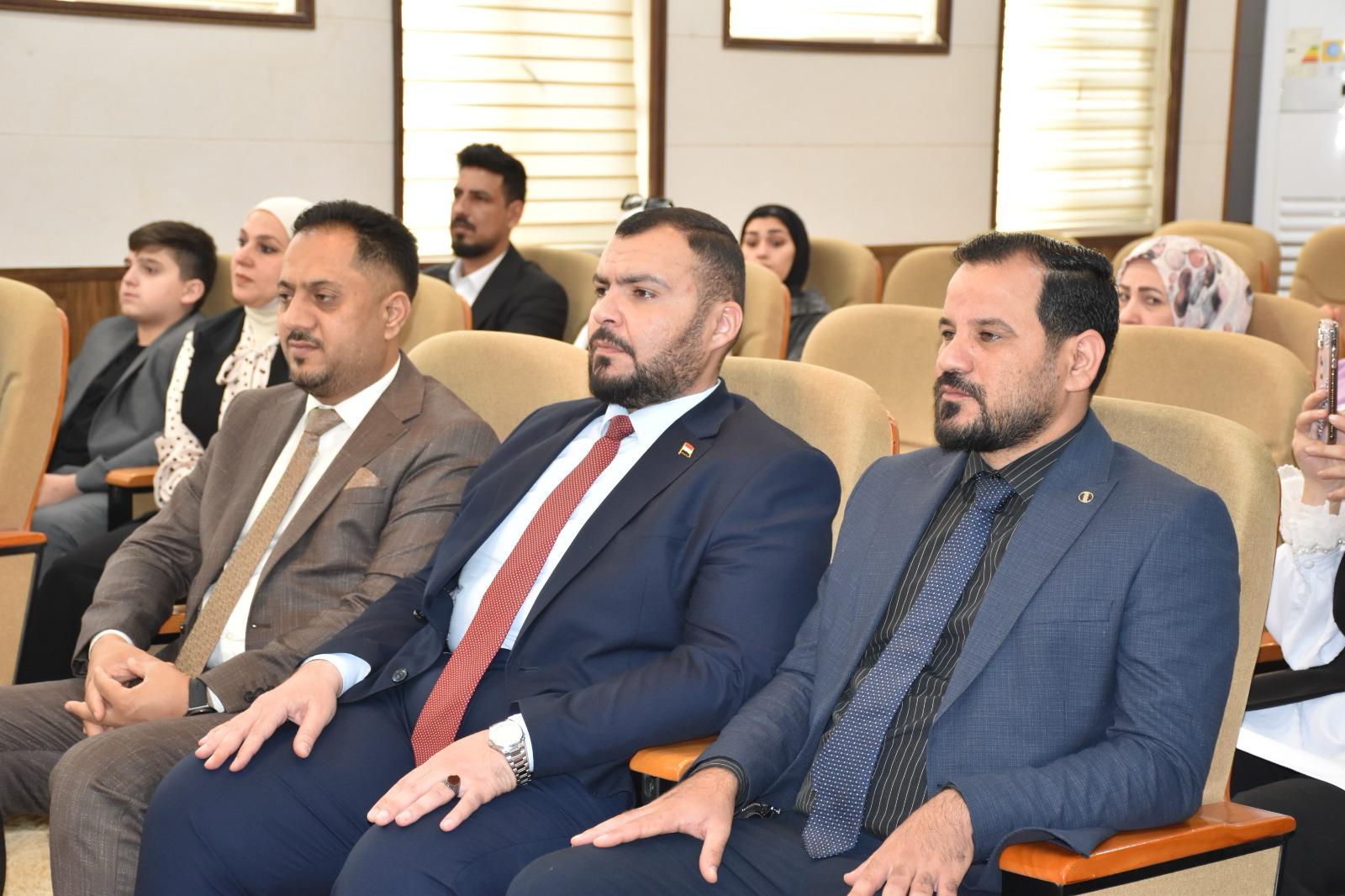 هذا وقد حضر المناقشة السيد مساعد رئيس الجامعة للشؤون الإدارية الأستاذ الدكتور حسين عبد إسماعيل المحترم عميد الكلية الاستاذ المساعد الدكتور محمود ماهر صالح المحترم عميد الكلية وعدد من التدريسيين وطلبة الدراسات العليا ، من جانبه قد السيد عميد الكلية كتب شكر وتقدير للدكتور علي حسن ناصر والدكتور امير صابر ماجد والدكتورة رنا بهجت إسماعيل تثميناً لجهورهم القيمة والمميزة في تقييم هذه الاطروحة .