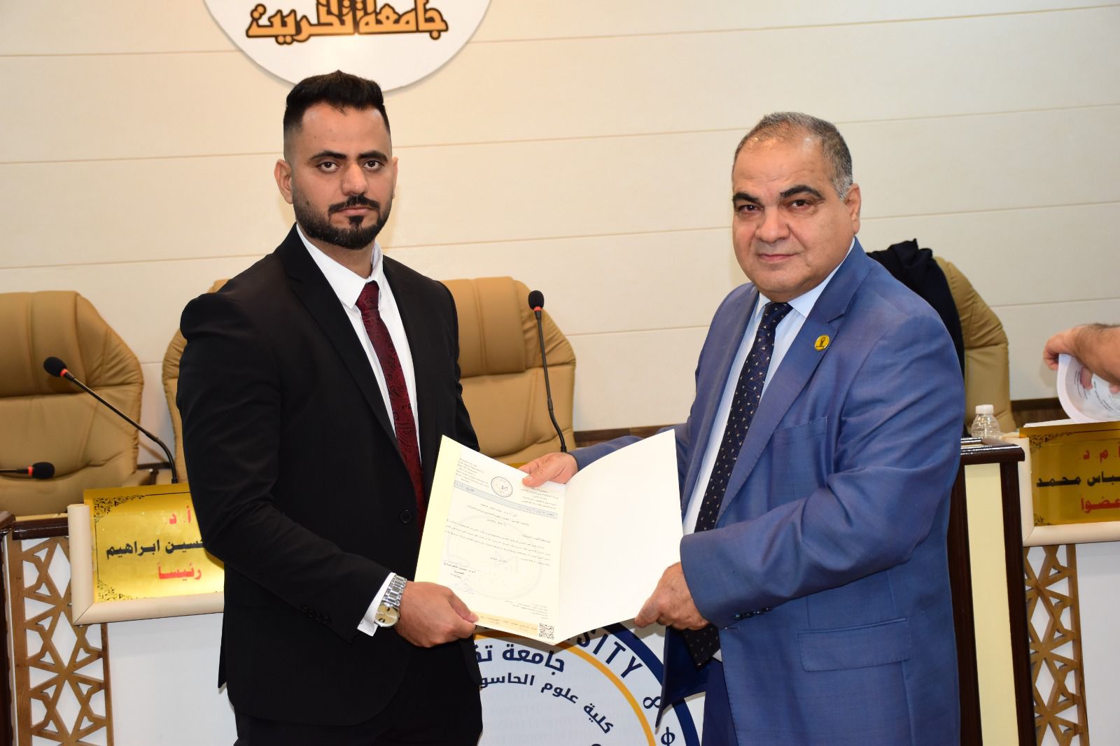 هذا وقد حضر المناقشة عدد من التدريسيين وطلبة الدراسات العليا، من جانبه قدم السيد عميد الكلية كتب شكر وتقدير للدكتور احمد عامر محمد والدكتورة ميسون مال االله عزيز، سلمها السيد مساعد رئيس الجامعة للشؤون العلمية الأستاذ الدكتور حسن حسين إبراهيم المحترم تثميناً لجهودهم العلمية في تقييم هذه الاطروحة .