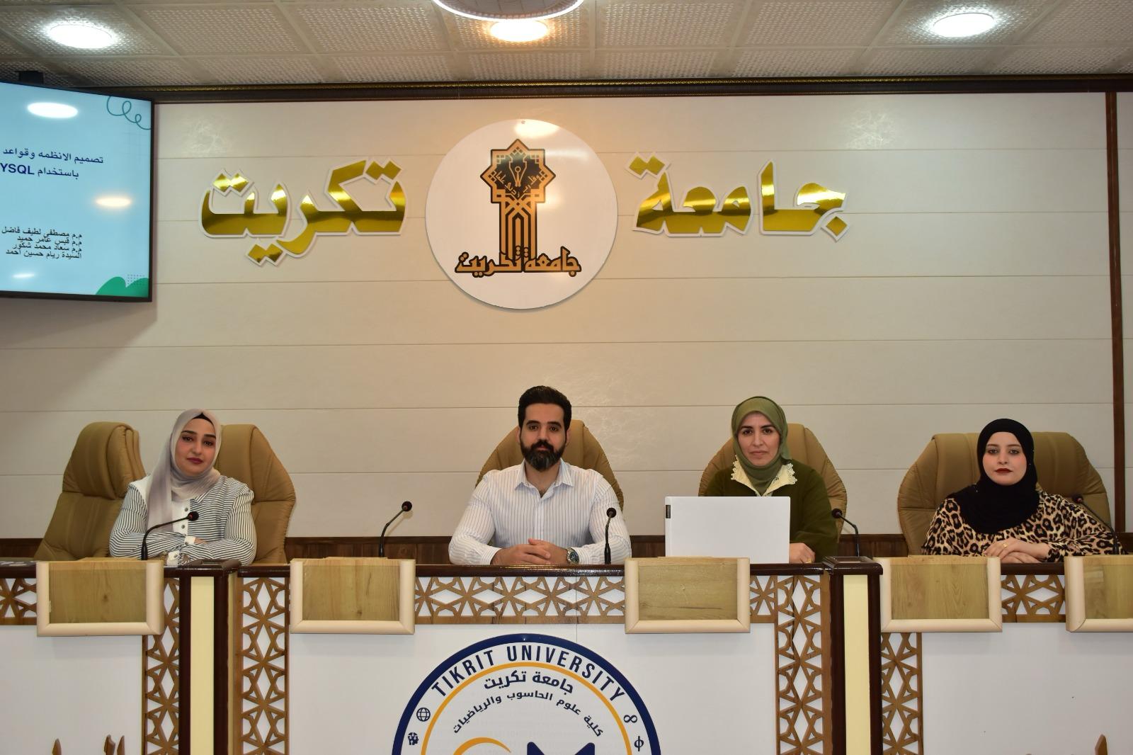برعاية الأستاذ الدكتور وعد محمود رؤوف المحترم رئيس جامعة تكريت، وبإشراف كل من الأستاذ المساعد الدكتور محمود ماهر صالح المحترم عميد كلية علوم الحاسوب والرياضيات، والأستاذ المساعد الدكتور سياف عبد حسين المحترم مدير مركز التعليم المستمر بجامعتنا، تقيم كلية علوم الحاسوب والرياضيات بالتعاون مع مركز التعليم المستمر دورة تدريبية بعنوان "تصميم الأنظمة وقواعد البيانات باستخدام MySQL".