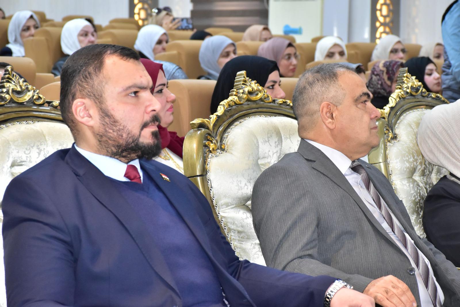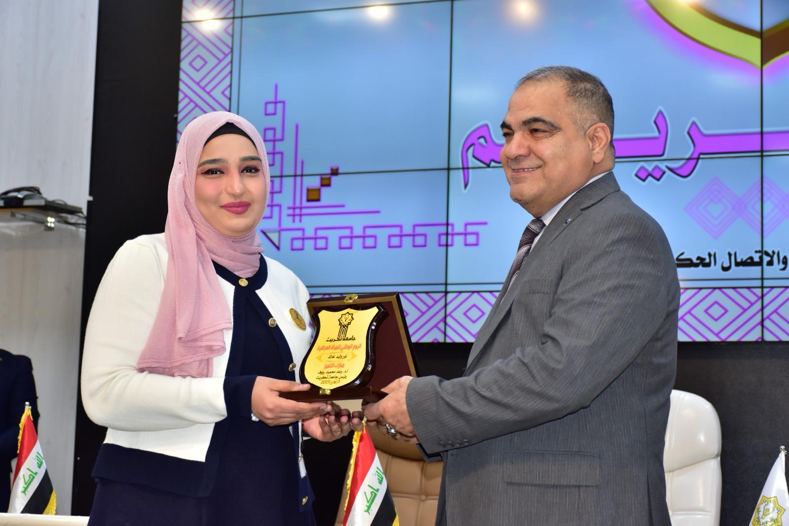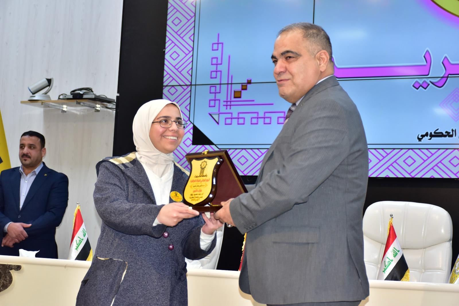 إذ تم خلال الحفل تكريم المدرس المساعد قبس عامر حميد والمدرس المساعد نور وليد خالد بدرع تقديرًا لجهودها المتميزة في دعم وتمكين المرأة داخل الوسط الأكاديمي، ولإسهاماتهن البارزة في خدمة الكلية والمجتمع.