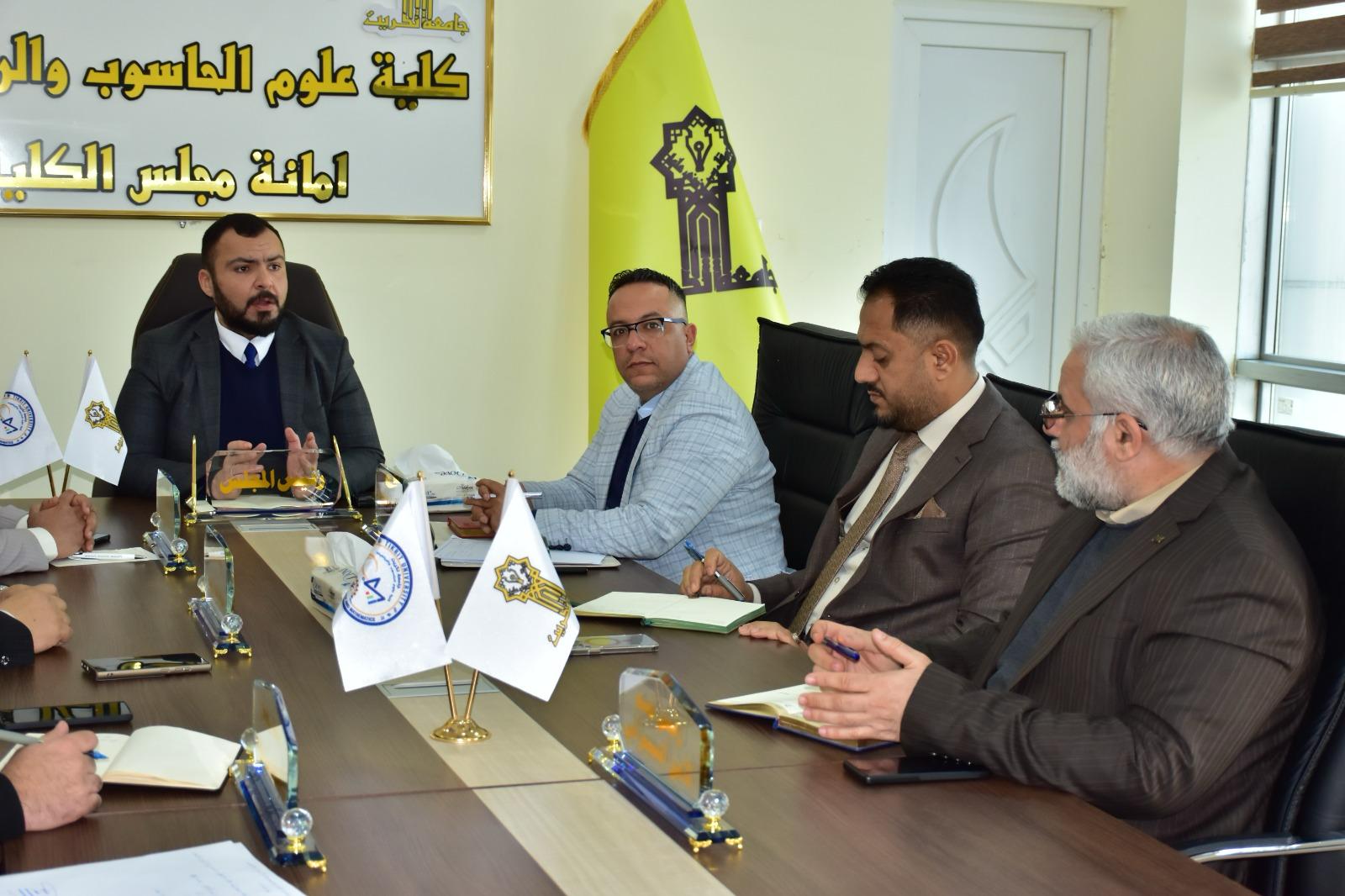 عقد مجلس كلية علوم الحاسوب والرياضيات جلسته الاعتيادية (الثامنة عشر) المفتوحة للعام الدراسي 2024-2025 اليوم الثلاثاء الموافق 10-3-2025 بحضور جميع اعضاء المجلس كافة ، حيث افتتح الأستاذ المساعد الدكتور محمود ماهر صالح عميد الكلية الجلسة بكلمة ترحيبية أشاد فيها بجهود الجميع، هذا وقد ناقش المجلس عدداً من القضايا في جدول أعماله .