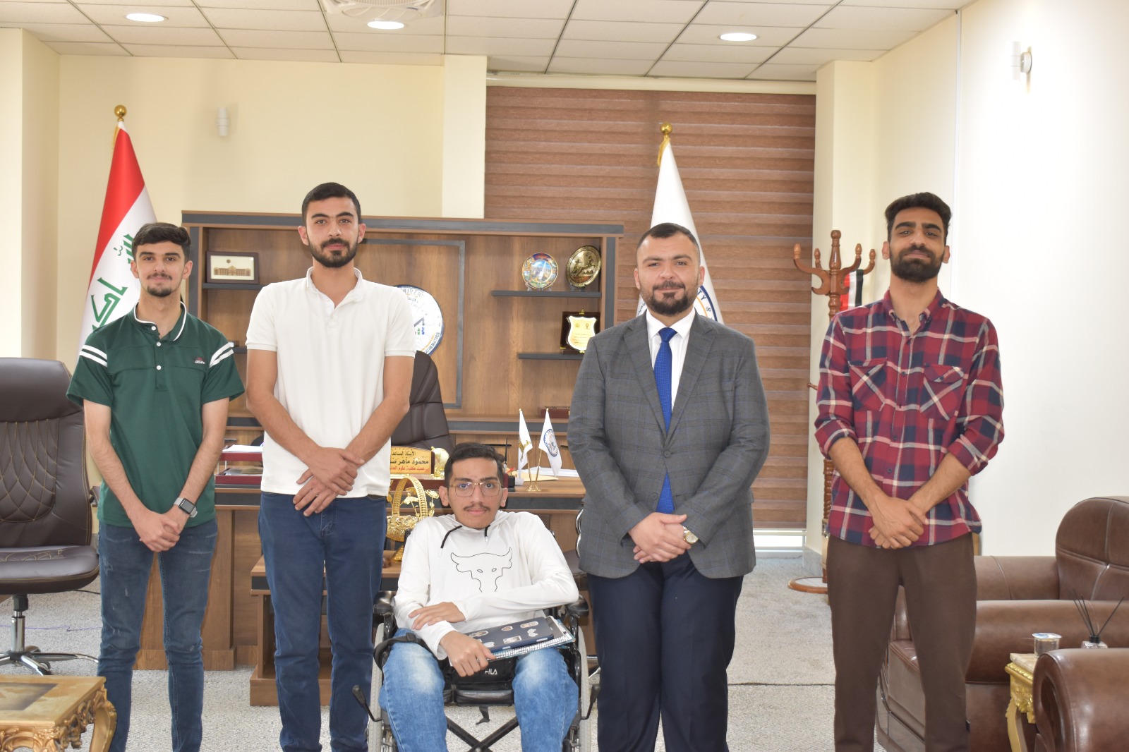التقى الاستاذ المساعد الدكتور محمود ماهر صالح المحترم بمجموعة من الطلبة المتميزين في قسم علوم الحاسوب اليوم الموافق 18-4-2024 حيث رحب السيد العميد بالطلبة واشاد بجهودهم العلمية الرائعة التي تحقق اضافة متميزة للجامعة والمجتمع في اطار دورها المجتمعي ، مؤكداً على دعمه الكامل لطلبة الكلية وتشجيعهم لرفع اسم الجامعة والكلية على مستوى الجامعات الاخرى .