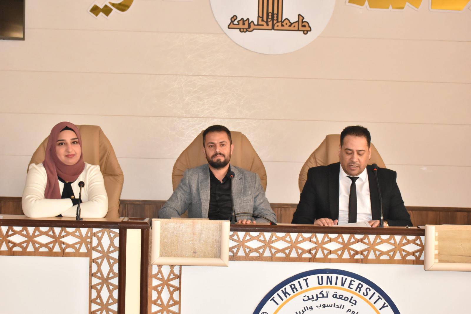برعاية الاستاذ الدكتور وعد محمود رؤوف المحترم رئيس جامعة تكريت وبإشراف الاستاذ المساعد الدكتور محمود ماهر صالح المحترم عميد كلية علوم الحاسوب والرياضيات واشراف الاستاذ المساعد الدكتور سياف عبدحسين المحترم مدير مركز التعليم المستمر اقامت كلية علوم الحاسوب والرياضيات وبالتعاون مع مركز التعليم المستمر ندوة علمية بعنوان ( المهام والواجبات التي يقوم بها المحاسب في المؤسسة )اليوم الاربعاء الموافق 5- 2-2025 ، من قبل المحاضرون: