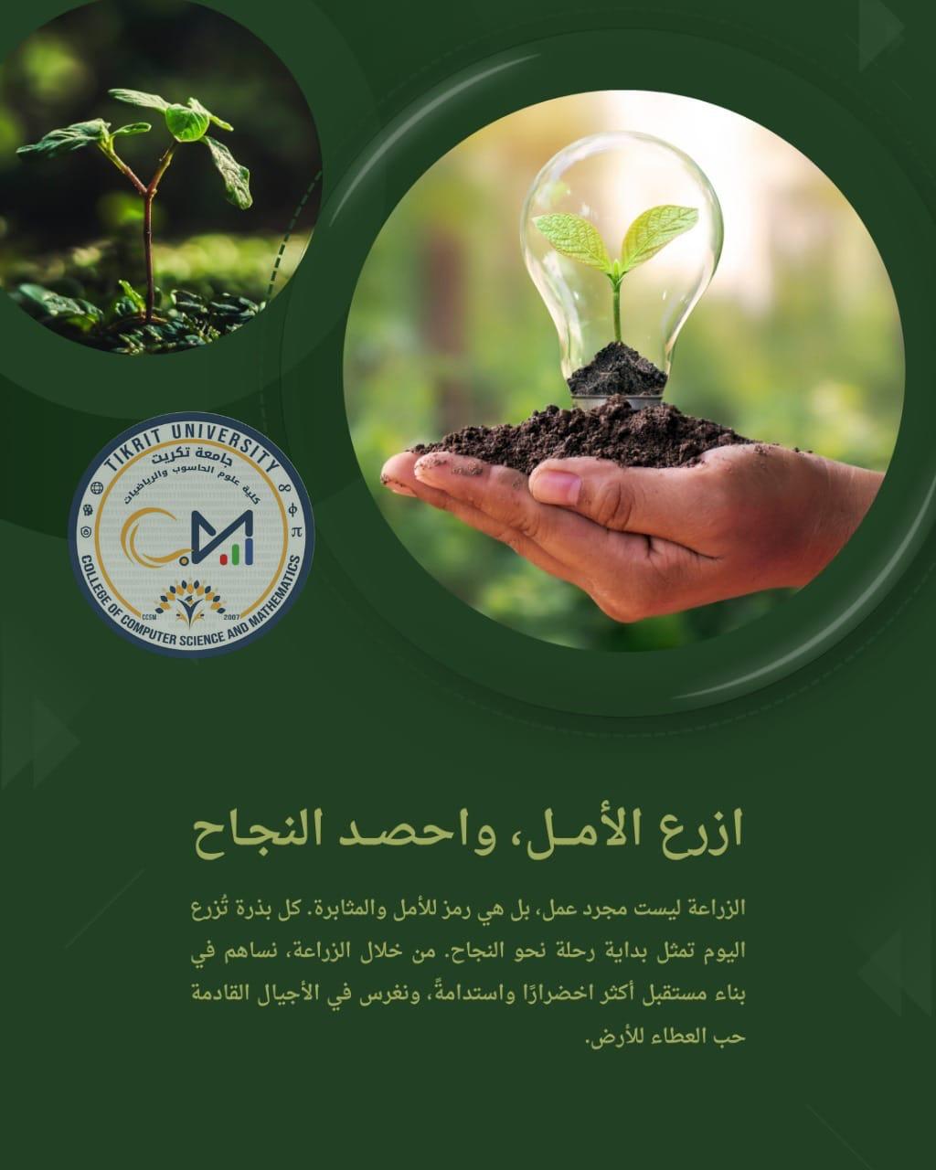 برعاية الأستاذ الدكتور وعد محمود رؤوف المحترم رئيس جامعة تكريت، وبإشراف كل من الأستاذ المساعد الدكتور محمود ماهر صالح المحترم عميد كلية علوم الحاسوب والرياضيات والأستاذ المساعد الدكتور سياف عبد حسين المحترم مدير مركز التعليم المستمر وفي إطار حرص كليتنا على تعزيز الوعي البيئي ونشر ثقافة التشجير، أقامت كليتنا ندوة بمناسبة يوم التشجير الوطني، وذلك بهدف تسليط الضوء على أهمية التشجير في تحسين البيئة، وتقليل التلوث، ودوره في التنمية المستدامة.