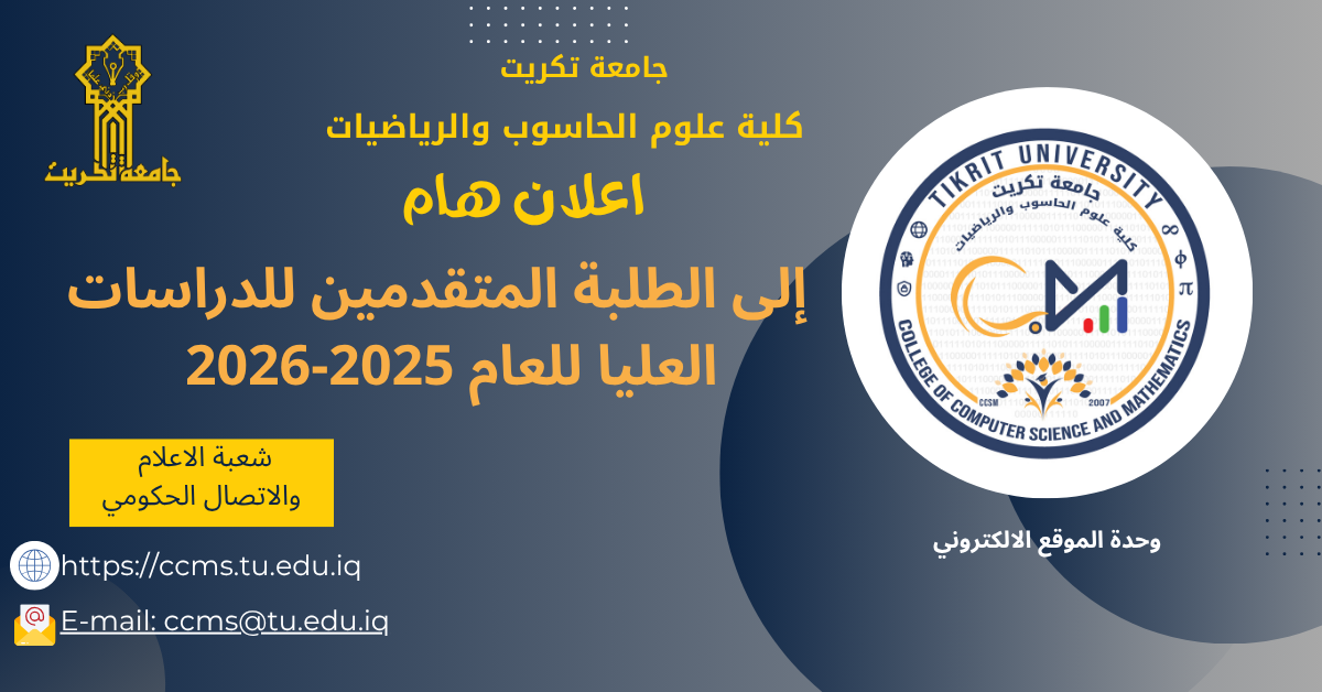 تدعو كلية علوم الحاسوب والرياضيات كافة المتقدمين للدراسات العليا للعام الدراسي 2025-2026، ممن أكملوا التقديم الإلكتروني أو حصلوا على مطابقة أولية، وكذلك من لم يستكملوا إجراءات المطابقة حتى الآن، إلى مراجعة شعبة الدراسات العليا في مبنى عمادة الكلية، خلال يومي الإثنين والثلاثاء الموافق 16 و17 -6- 2025، وذلك لغرض استكمال تدقيق الملفات والمطابقة الرسمية.